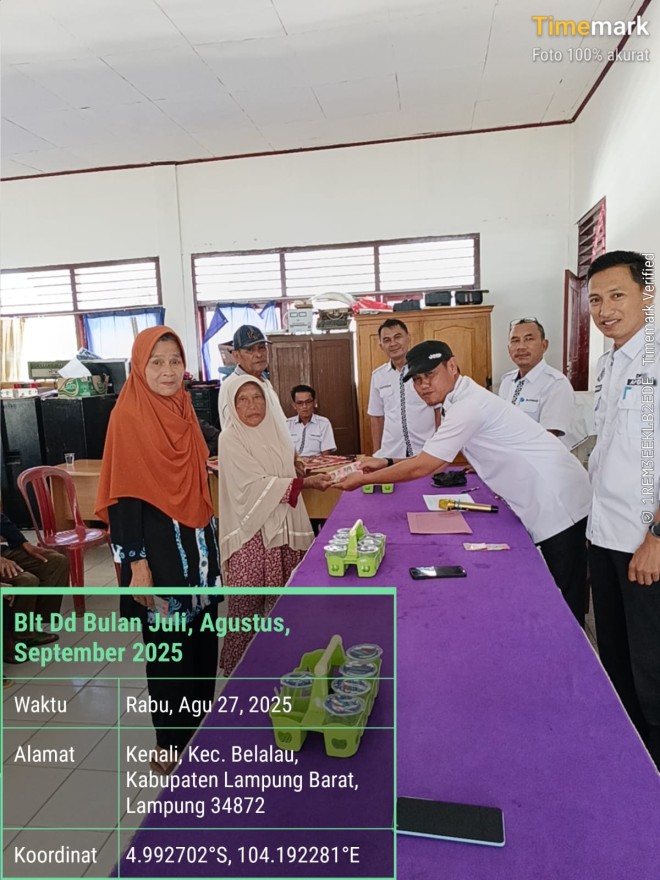 Pemerintah Pekon Kenali, Kecamatan Belalau, Kabupaten Lampung Barat. melaksanakan penyaluran Bantuan Langsung Tunai Dana Desa (BLT DD) bagi Keluarga Penerima Manfaat (KPM) yang sakit dan lansia. Penyaluran dilakukan Di Balai Pekon Kenali Dan door-to-door untuk memastikan bantuan sampai langsung kepada mereka yang membutuhkan. Rabu (27/08/25).